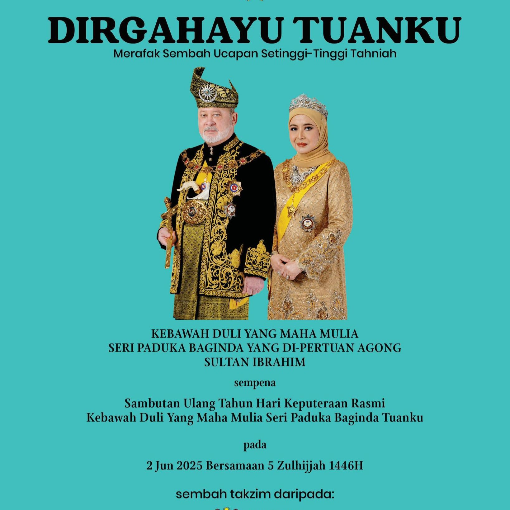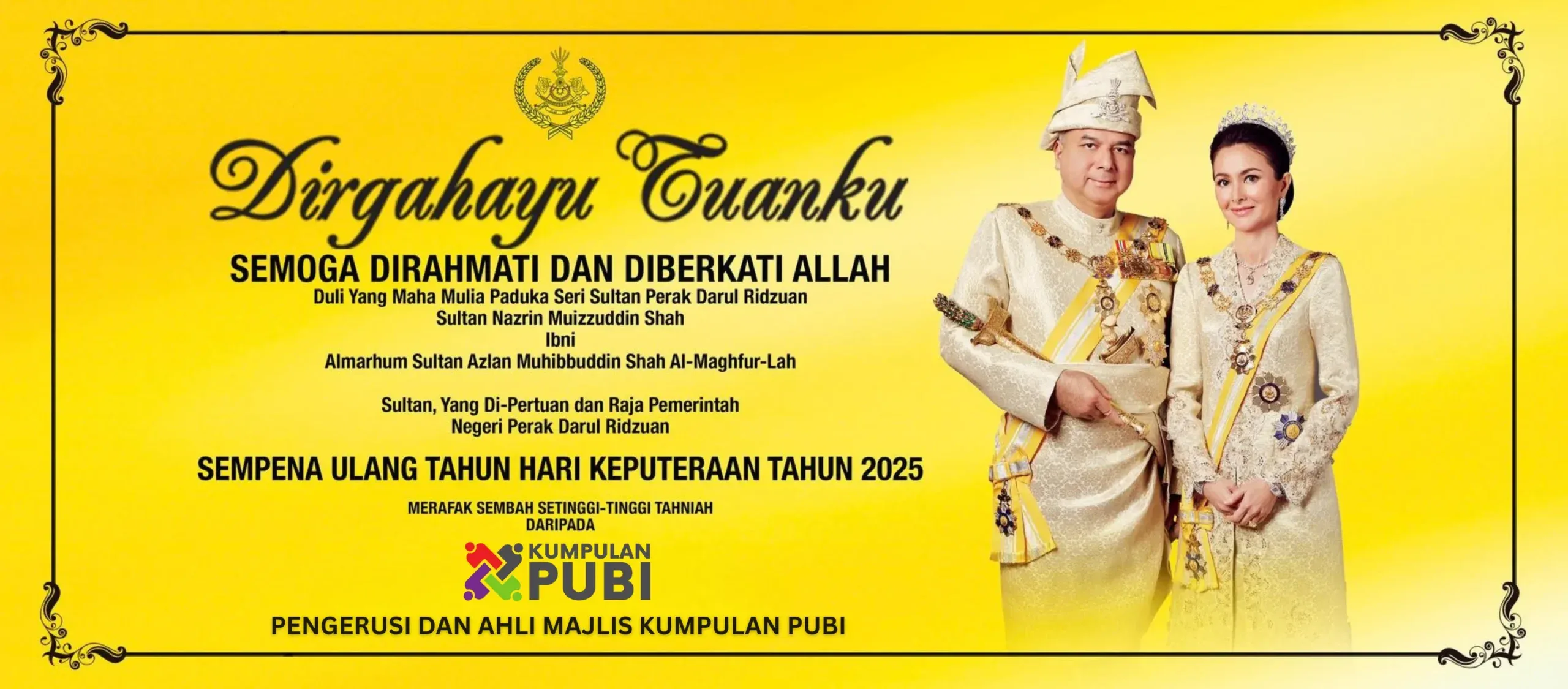 Duli Yang Maha Mulia Paduka Seri Sultan Perak Darul Ridzuan Sultan Nazrin Muizzuddin Shah Ibni Almarhum Sultan Azlan Muhibbuddin Shah Al-Maghfur-Lah, Sultan, Yang Di-Pertuan dan Raja Pemerintah Negeri Perak Darul Ridzuan. Sempena Sambutan Ulang Tahun Hari Keputeraan Tahun 2025 Merafak Sembah Setinggi-Tinggi Tahniah daripada Pengerusi dan Ahli Majlis Kumpulan PUBI.
